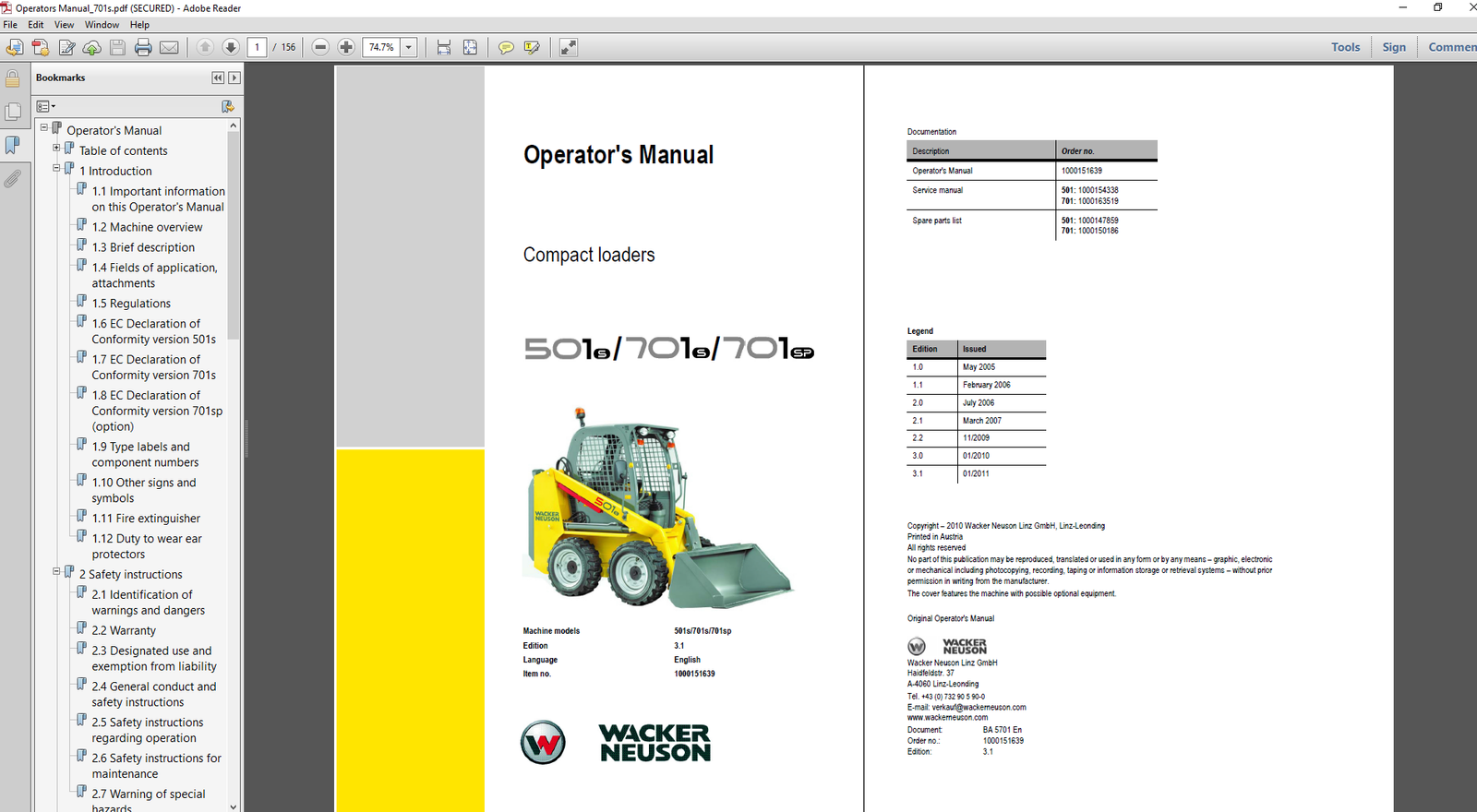 Wacker Neuson 501S, 701S, 701SP Skid Steer Operator’s Manual PDF Download