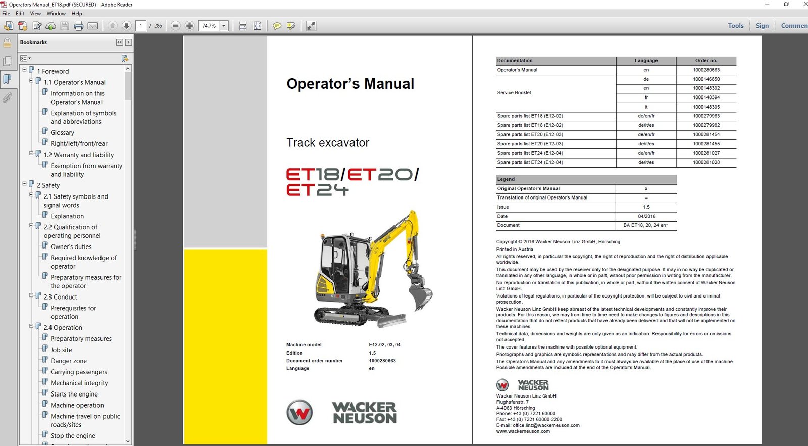 Get your Wacker Neuson ET18, ET20, ET24 Excavator Operator’s Manual PDF download today and operate your machine like a professional!