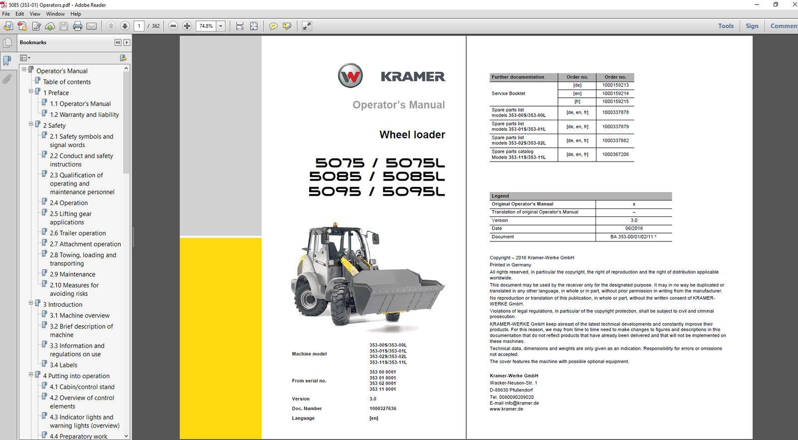 Wacker Neuson Kramer 5075, 5075L, 5085, 5085L, 5095, 5095L Wheel Loader Operator’s Manual – PDF Download