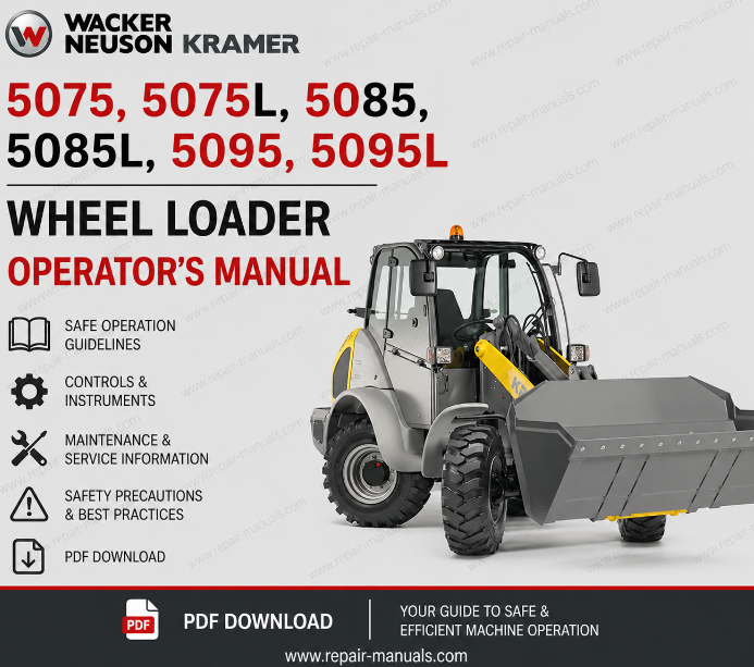 Download the complete Wacker Neuson Kramer Wheel Loader Operator’s Manual covering models 5075, 5075L, 5085, 5085L, 5095, and 5095L in high-quality PDF format. This official-style operator’s guide is essential for safe operation, daily maintenance, and understanding machine controls.