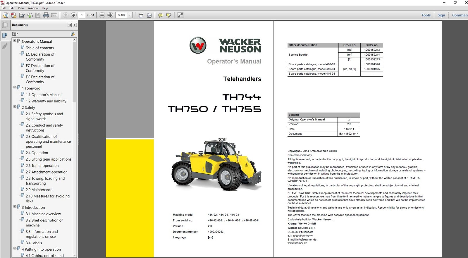 Get the complete Operator’s Manual for Wacker Neuson TH744, TH750, and TH755 Telehandlers in convenient PDF format. This manual is essential for operators, technicians, and equipment owners who want to ensure safe operation, proper handling, and maximum performance of their machines.