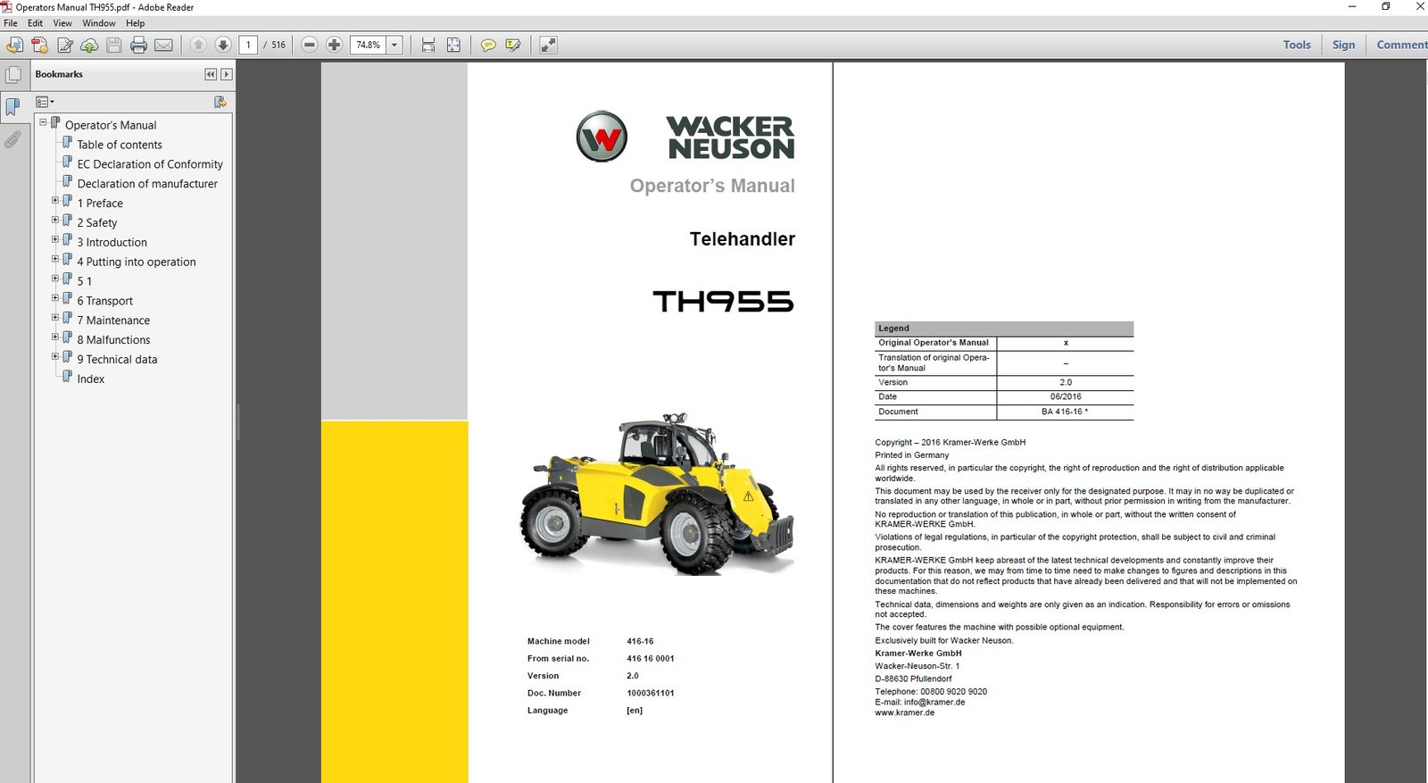 Wacker Neuson TH955 Telehandler Operator’s Manual PDF Download